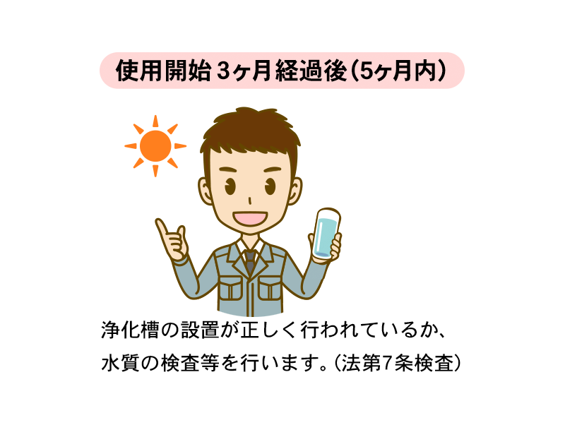 新たに設置された浄化槽については、浄化槽法第7条の規定により、その使用開始後3ヶ月を経過した時点から県知事が指定した検査機関(指定検査機関)の行う水質に関する検査を受けなければならないことになっています。