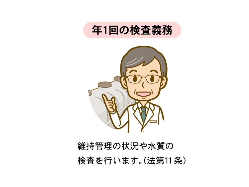すべての浄化槽について、浄化槽法第11条の規定により、7条検査の受検後、毎年1回、定期的に県知事が指定した検査機関(指定検査機関)の行う水質に関する検査を受けなければならないことになっています。
